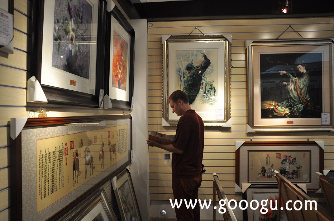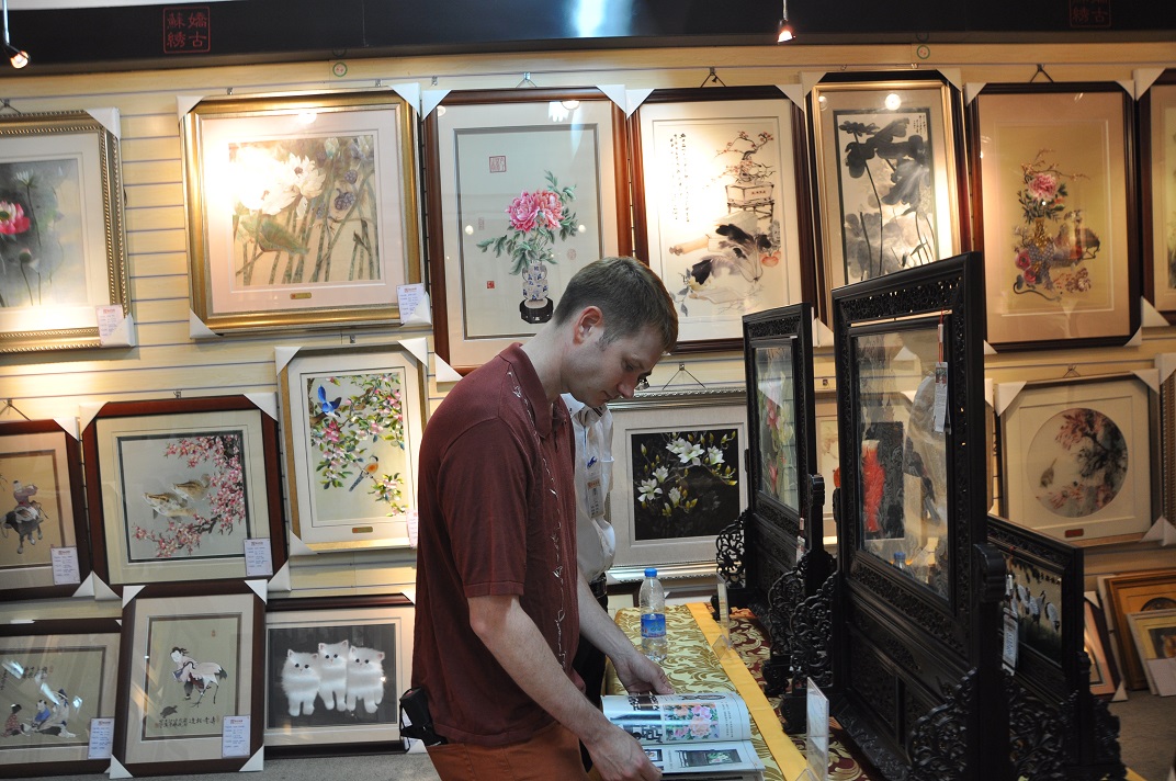 蘇繡嬌古蘇繡藝術(shù)品有限公司是一家集蘇繡設(shè)計、制作、銷售于一體的綜合性企業(yè),公司擁有員工數(shù)百人,工藝師數(shù)十人,近年來嬌古蘇繡不斷加強企業(yè)的文化建設(shè),提升企業(yè)的綜合實力。今年3到5月份嬌古蘇繡接到了國內(nèi)某大型企業(yè)的蘇繡訂單,訂制一批蘇繡禮品作為商務(wù)禮品在企業(yè)周年慶典之際贈與外國來賓。 接到訂單之后嬌古蘇繡工作人員立即著手,根據(jù)企業(yè)提出的要求開始設(shè)計作品,在歷時近2個月的時間里,順利完成訂單。來自美國的外賓peter在接到禮品時,被嬌古蘇繡的精湛工藝所折服,今天親自來到蘇州嬌古蘇繡總部蘇州展廳,peter非常喜歡蘇繡,好像每一件作品他都非常的喜歡,工作人員為peter做了認真的講解。 .jpg)