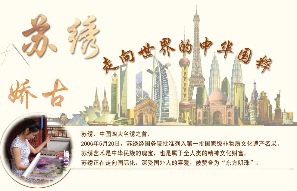 蘇繡發(fā)源于蘇州,是四大名繡之一,至今已有2500多年的歷史了。蘇州女子性情柔和,心靈手巧,擅長慢針細(xì)活。蘇州有10多萬繡娘,在農(nóng)村,家家有刺繡,戶戶有繡娘。蘇繡在江蘇蘇州一帶具有廣泛的群眾基礎(chǔ),到處都有藝人們飛針走線,繡出了無數(shù)佳品。特別是古老的蘇州雖經(jīng)過了2500年的風(fēng)風(fēng)雨雨,吳文化生生不息、代代相傳,至今仍然是戶戶有刺繡的繁榮景象。蘇繡工藝是以繡針引彩線,按設(shè)計(jì)好的圖案花紋和色彩,在尼龍、真絲,綢緞、棉布等面料上穿針引線,繡制成一幅幅形象逼真的藝術(shù)品。蘇繡是我國著名的手工藝品,素以精細(xì)雅潔馳名中外,多次被國家領(lǐng)導(dǎo)人作為國家級(jí)禮品贈(zèng)送給外賓朋友。