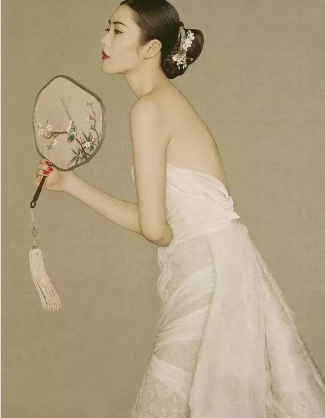 眉眼細(xì)挑的劉雯身穿西方高定禮服,卻頭插珠翠,手持團(tuán)扇,婷婷而立,眉目間自然恬淡,透露出一絲嬌慵,宛若古時(shí)畫中人。