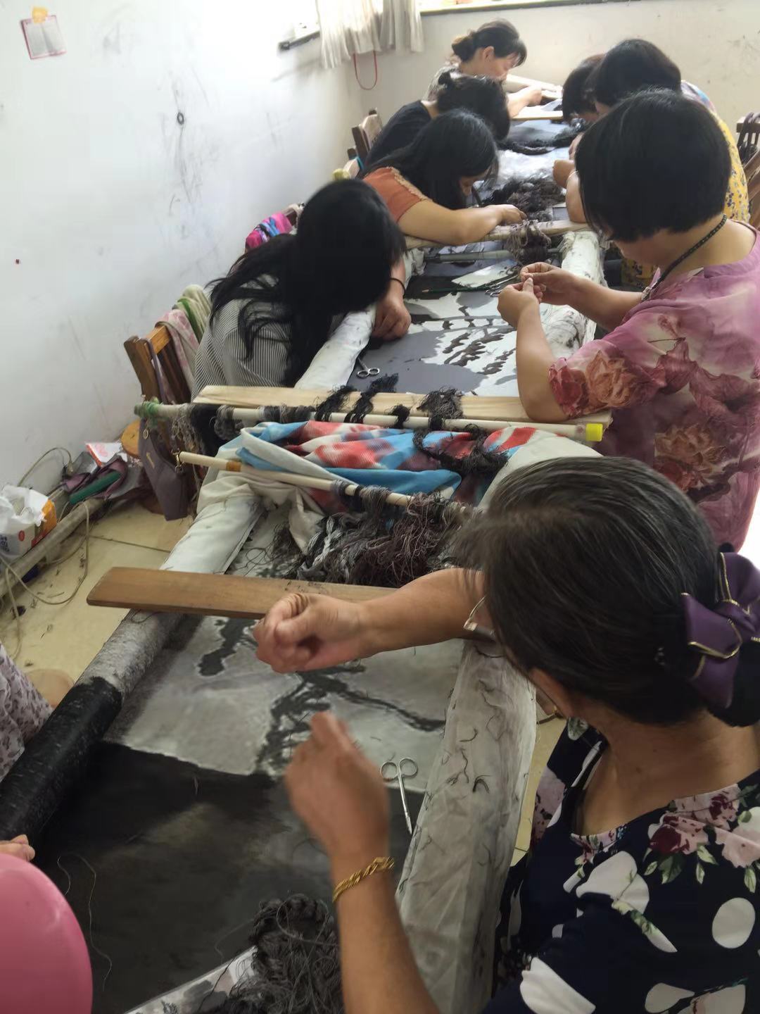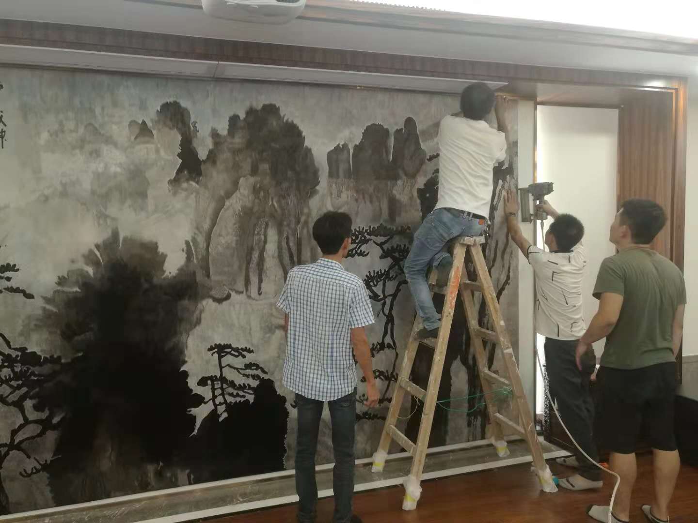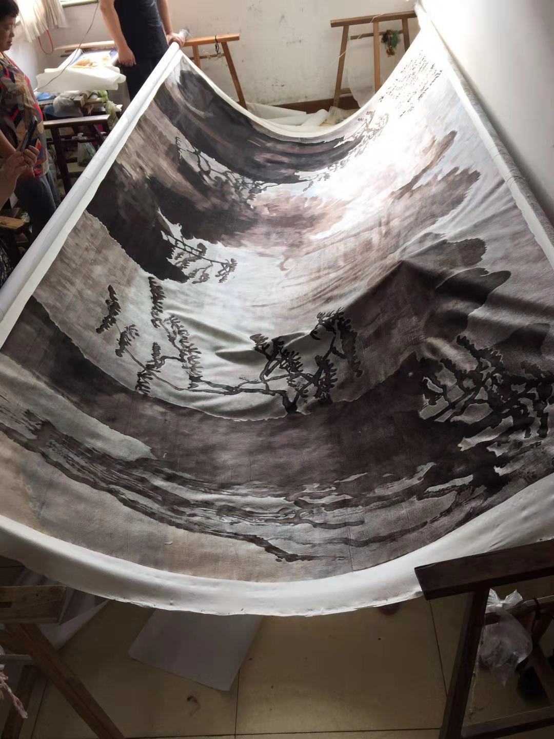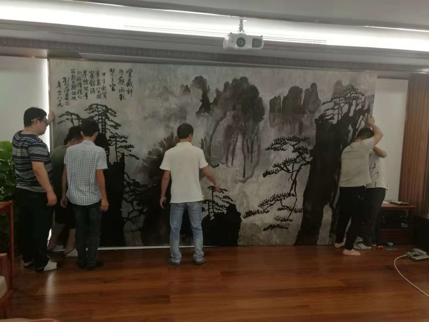 專業(yè)師傅現(xiàn)場(chǎng)裝裱 這次的背景墻是用于董事長(zhǎng)會(huì)見(jiàn)要客的VIP接待室,蘇繡刺繡尺寸長(zhǎng)4.1米,高2.35米,在多位繡娘的緊張合作下,耗時(shí)3個(gè)多月完成。