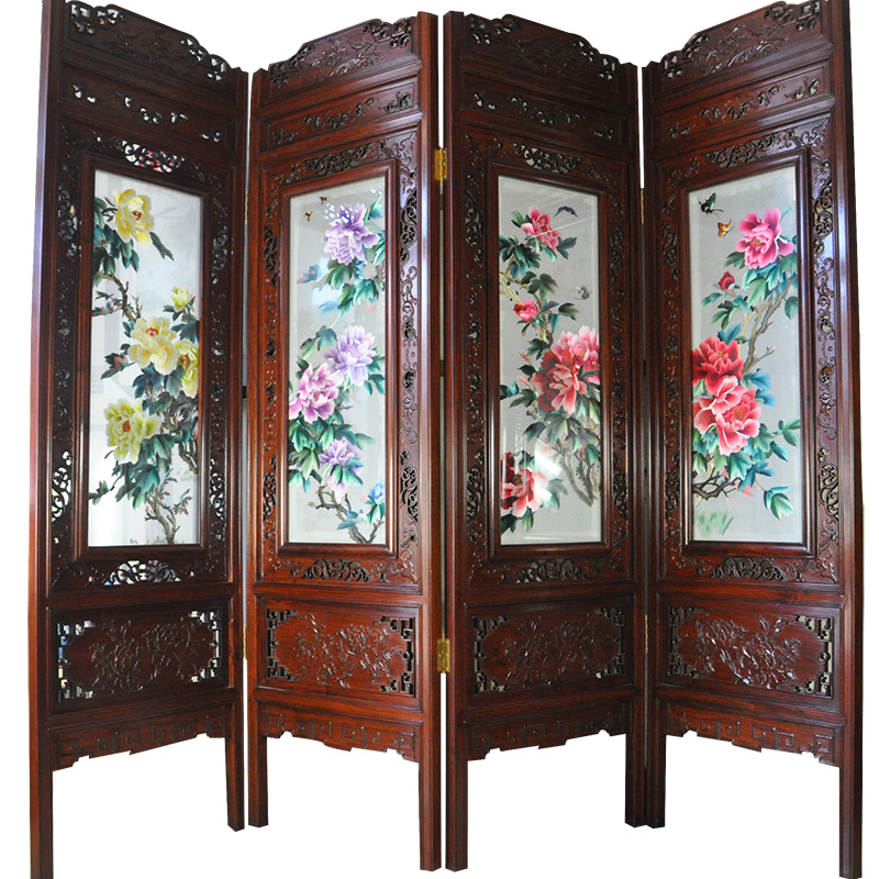 蘇繡屏風(fēng) 手工刺繡 大型四扇折疊屏風(fēng) 牡丹花 紅木工藝品