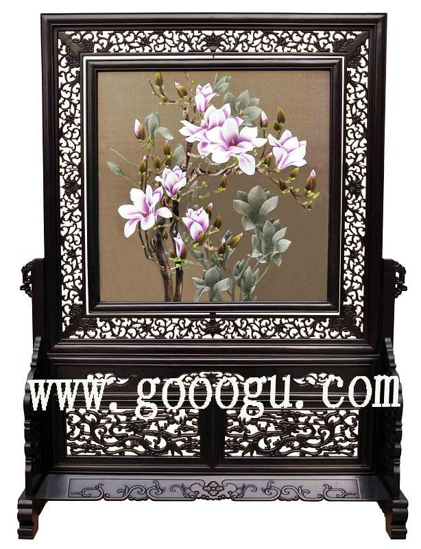 玉蘭花細(xì)節(jié)照(局部圖) 產(chǎn)品名稱:40X40CM紫檀蘇繡雙面繡 (作品代碼:SY-488) 產(chǎn)品規(guī)格:刺繡圖案尺寸 40X40CM 外框整體尺寸最寬處65CM,高85CM 產(chǎn)品工藝:蘇州繡娘手工刺繡。繡品圖案部分可360度旋轉(zhuǎn) 產(chǎn)品材質(zhì):真絲面料+桑蠶絲線+玻璃+紫檀木架 產(chǎn)品包裝:錦盒禮品裝 嬌古出廠價(jià):收藏級(jí)別,限量發(fā)行,嬌古蘇繡參考價(jià),22000元 最小起訂量:1件----廠家直銷,可當(dāng)天發(fā)貨(可混配圖案) 產(chǎn)品描述:【40X40CM檀木雙面繡】蘇州雙面繡為蘇州刺繡工藝師純手工刺繡而成,木框材質(zhì)為紫檀,整體框架花紋雕刻細(xì)膩。圖案有花卉(牡丹,梅花,荷花,蘭花等),花鳥(niǎo),動(dòng)物(熊貓,老虎,魚(yú)等),山水,風(fēng)景,名家字畫(huà)等。圖案多達(dá)一百多種,有古色古香的,有現(xiàn)代氣息的,高貴典雅,是贈(zèng)送客人的特色禮品之一。此款選取嬌古蘇繡資深高級(jí)工藝師歷時(shí)半年精心刺繡而成,每款題材的繡者均是專攻山水、牡丹或相關(guān)題材達(dá)數(shù)十載之久的專業(yè)技師。全國(guó)每年發(fā)行一件。歡迎收藏!