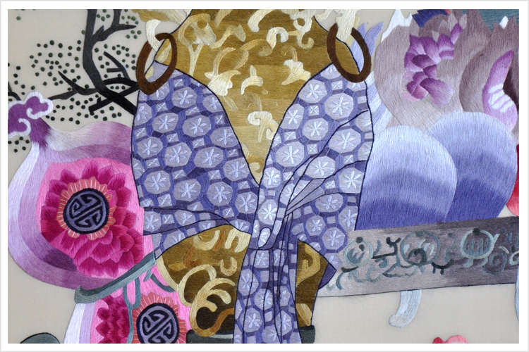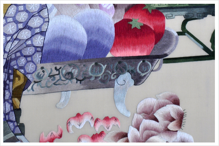 【品 牌】:嬌古 (作品代碼 D-1032) 【品 名】:吉祥富貴裝飾畫(huà)(手工蘇繡) 【品 質(zhì)】:2-4絲刺繡 (蘇繡小知識(shí):1根蘇繡絲線可分為16絲,中檔刺繡皆為10絲所繡,中高檔刺繡皆為6-8絲,高檔刺繡皆為4-6絲,精品刺繡皆為1-4絲) 【尺 寸】:畫(huà)心尺寸53*83cm 整體尺寸77*113cm 【產(chǎn)品工藝】:手工刺繡 【絲線材質(zhì)】:蠶絲線 【用 途】:居家裝飾及政府禮品、外賓禮品、生日禮物、賀壽禮品、領(lǐng)導(dǎo)升遷、出國(guó)禮品等等。 【出廠價(jià)格】:12000元 【細(xì)節(jié)欣賞】