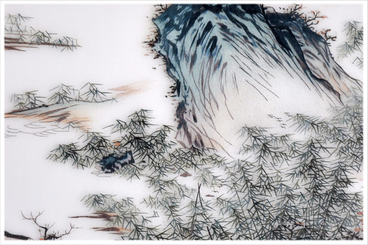 【品 牌】:嬌古 (作品代碼 D-1028) 【品 名】:南岸山水裝飾畫(huà)(手工蘇繡) 【品 質(zhì)】:1-2絲刺繡 (蘇繡小知識(shí):1根蘇繡絲線可分為16絲,中檔刺繡皆為10絲所繡,中高檔刺繡皆為6-8絲,高檔刺繡皆為4-6絲,精品刺繡皆為1-4絲) 【尺 寸】:畫(huà)心尺寸50*100cm 整體尺寸75*130cm 【產(chǎn)品工藝】:手工刺繡 【絲線材質(zhì)】:蠶絲線 。 【用 途】:居家裝飾或送政府禮品、外賓禮品、生日禮物、賀壽禮品、領(lǐng)導(dǎo)升遷、出國(guó)禮品等等。 【出廠價(jià)格】:15000元 【細(xì)節(jié)圖】