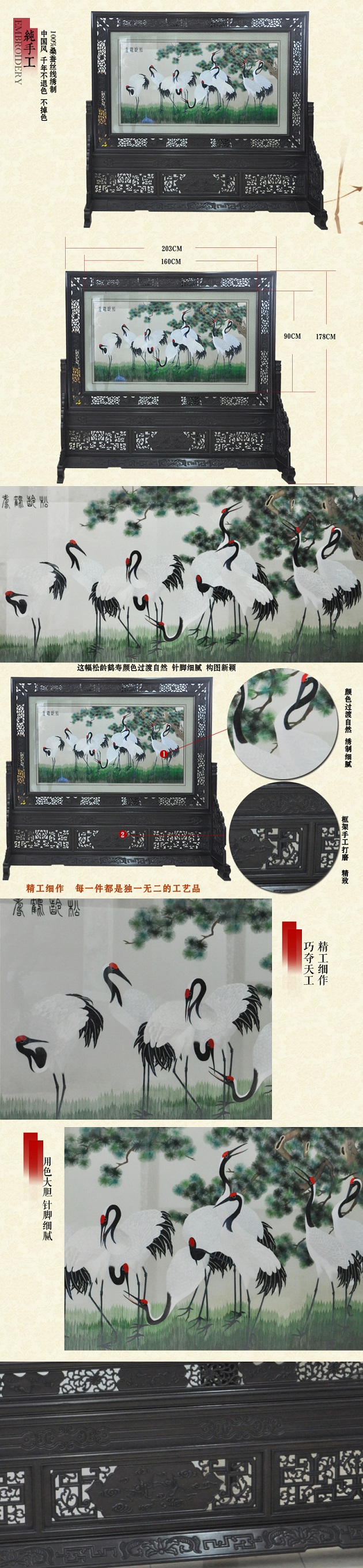 【產(chǎn)品名稱】:松鶴延年(雙面繡) (作品代碼:p-1526) 【產(chǎn)品規(guī)格】:圖案尺寸寬度160cm,高度90cm 外框整體尺寸寬203cm,高178cm 【產(chǎn)品工藝】:手工刺繡 【產(chǎn)品材質(zhì)】:真絲面料+雞翅木+桑蠶絲線+玻璃 【產(chǎn)品包裝】:木箱包裝,用海綿包扎,確保運輸安全 【出廠價】:24800元 【產(chǎn)品運輸】:我司負(fù)責(zé)發(fā)往客戶指定地點,蘇州附近城市可送貨上門! 【產(chǎn)品說明】:松鶴延年雙面繡屏風(fēng),是由蘇州工藝師耗時數(shù)個月精心手工刺繡而成,刺繡圖案以代表健康長壽的松鶴為題材繡工精細(xì),簡約 大方,顏色搭配均勻過渡自然,屏風(fēng)的框架選用進(jìn)口的雞翅木為料,是蘇繡屏風(fēng)中的經(jīng)典作品。是居家和辦公的重要裝飾品之一!歡迎親臨嬌古蘇繡展示廳觀看實物! .jpg)