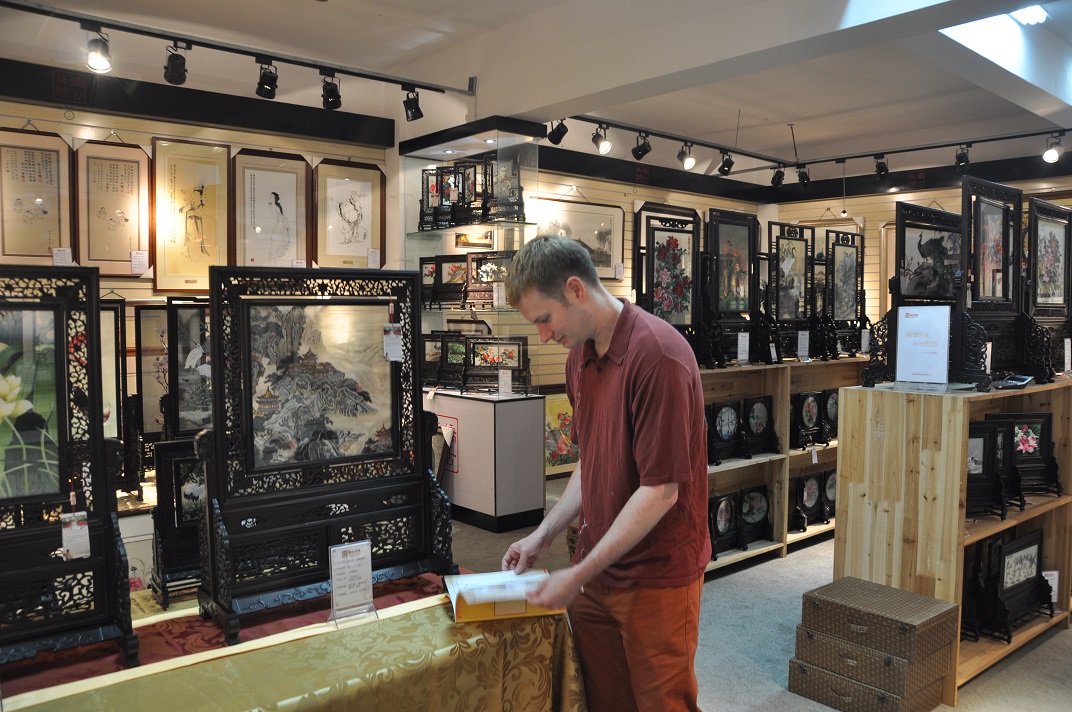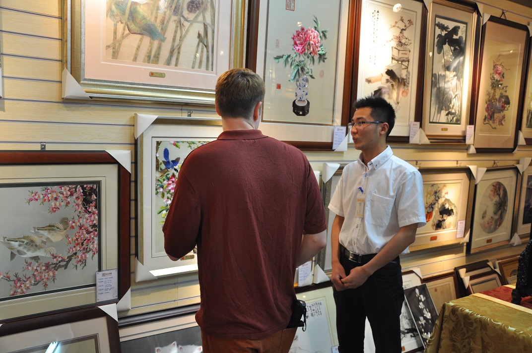 蘇繡嬌古蘇繡藝術(shù)品有限公司是一家集蘇繡設(shè)計、制作、銷售于一體的綜合性企業(yè),公司擁有員工數(shù)百人,工藝師數(shù)十人,近年來嬌古蘇繡不斷加強企業(yè)的文化建設(shè),提升企業(yè)的綜合實力。今年3到5月份嬌古蘇繡接到了國內(nèi)某大型企業(yè)的蘇繡訂單,訂制一批蘇繡禮品作為商務(wù)禮品在企業(yè)周年慶典之際贈與外國來賓。 接到訂單之后嬌古蘇繡工作人員立即著手,根據(jù)企業(yè)提出的要求開始設(shè)計作品,在歷時近2個月的時間里,順利完成訂單。來自美國的外賓peter在接到禮品時,被嬌古蘇繡的精湛工藝所折服,今天親自來到蘇州嬌古蘇繡總部蘇州展廳,peter非常喜歡蘇繡,好像每一件作品他都非常的喜歡,工作人員為peter做了認真的講解。 .jpg)