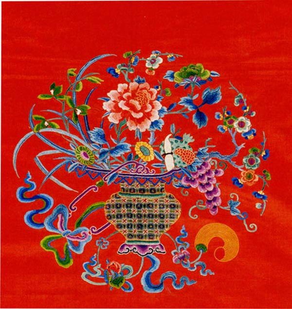 清代光緒“紅緞繡五彩花籃紋桌帷料”。此桌帷以紅色緞為面料,在紅色緞面料上,以綠、藍、白、紅、黃為主色調(diào),18種彩色絨線及捻金線為繡線,運用2-5潤色法,采用齊針、散套針、正戧針、打籽針、松針、雞毛針、緝線、網(wǎng)繡、滾針、平金、刻鱗等針法,繡制寓意“連富貴三多”之意的蘭花、牡丹、梅花、石榴、葡萄等花卉紋,均插在花籃里,在花籃的穗上系有蝙蝠、壽桃,組成花籃式團形圖案。此桌帷尤其是用網(wǎng)格技巧繡花籃,用滾針繡花籃的穗,用正戧針繡葡萄、牡丹花瓣等,使花紋形態(tài)生動而逼真,活潑而具有生氣。 |