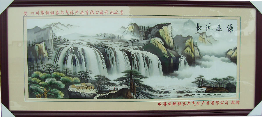 蘇繡裝飾畫案例: 畫框玻璃外可加開業(yè)貼贈送單位名稱,祝福詞語等,可見以下案例:
