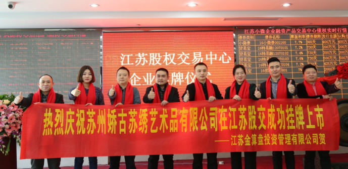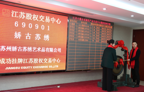 ?? 2016年12月9日,蘇州嬌古蘇繡藝術(shù)品有限公司掛牌上市儀式在江蘇股交中心隆重舉行。簡稱“嬌古蘇繡”,股權(quán)代碼“690901”。伴隨著莊重而響亮的鑼聲,嬌古邁出了跨越式的一步。???? ?? 就嬌古蘇繡掛牌成功,公司董事長張奇?zhèn)ハ壬硎尽肮纠響?yīng)將完善企業(yè)治理機構(gòu),提升企業(yè)競爭力放在首位,不辜負資本市場對嬌古的認可及支持。這也是公司一個飛躍式進步,一個重要里程碑。嬌古員工們將其作為強大的動力,更好、更快的為廣大客戶服務(wù)。規(guī)范和健全企業(yè)發(fā)展機制,是我們的目標。但我們相信,掛牌成功,對企業(yè)的規(guī)范化、影響力有著不可小覷的力量。在此,我僅代表全體公司人員,感謝股交中心長期以來的支持與信任,感謝所有工作人員辛勤的付出!”