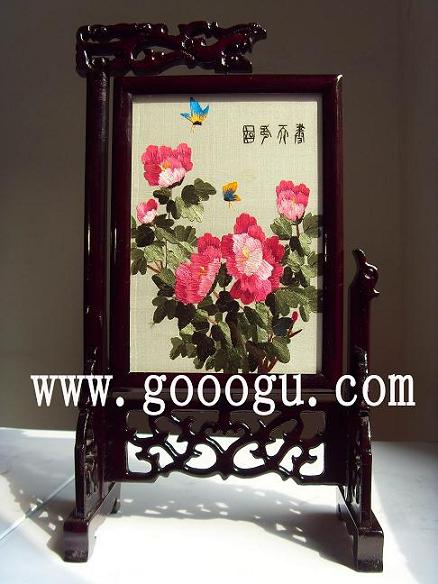 (一) 普通檔蘇州雙面繡:普通檔蘇州雙面繡以其圖案做工一般,框架材質(zhì)普通(多以菠蘿格為木質(zhì)),繡片做工多以一根粗線或一絨構(gòu)成。尺寸方面以小規(guī)格為主,常規(guī)尺寸為20圓厘米直徑,三十圓厘米直徑,14*20CM(畫心尺寸) 16*25CM(畫心尺寸),30CM圓直徑等。名稱民間稱法不一,筆者就此做簡(jiǎn)單的介紹,如單龍頭架,雙龍頭架,同心圓等,。包裝方面目前以簡(jiǎn)單禮盒裝為主(筆者認(rèn)為做為禮品還欠缺,有待改進(jìn))。目前以擺在桌面臺(tái)屏雙面繡為主。蘇繡圖案多以牡丹,花草,小動(dòng)物為主,目前整體圖案搭配創(chuàng)新方面不是太強(qiáng)。在國(guó)內(nèi)蘇繡市場(chǎng)普通檔蘇州雙面繡目前所占的比重比較大,普遍價(jià)格不高,出廠價(jià)一般在一百至兩百元左右。是目前很多企業(yè)采購的重點(diǎn)檔次選擇之一??勺鰹槠髽I(yè)商務(wù)禮品,會(huì)議禮品,紀(jì)念禮品。加上燙金工藝,是企業(yè)宣傳廣告的好載體之一。