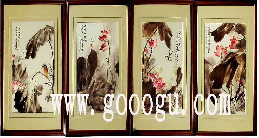 荷花風情四件套裝蘇繡畫|手工藝裝飾畫|傳統(tǒng)居家畫