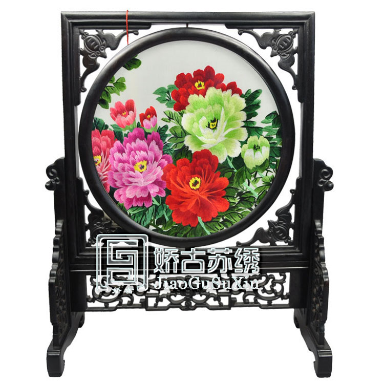 嬌古蘇繡16X25CM雞翅木雙面繡橫座屏,手工刺繡工藝品饋贈(zèng)老外特色禮品