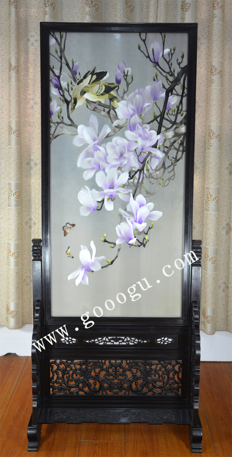 蘇繡工藝品裝飾 手工刺繡 玉蘭花鳥(niǎo) 紫檀木玄關(guān)