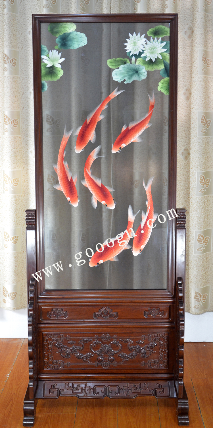 蘇繡玄關(guān)屏風(fēng) 蓮花魚(yú) 紅木框架 純手工