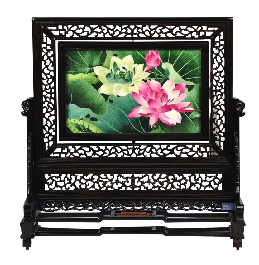 產(chǎn)品名稱:紫檀蘇州雙面繡 (作品代碼:SZ-7889) 產(chǎn)品規(guī)格:46X41CM(外框尺寸) 25X16CM(繡品尺寸) 產(chǎn)品工藝:蘇州繡娘手工刺繡。繡品圖案部分可360度旋轉(zhuǎn) 產(chǎn)品材質(zhì):真絲面料+桑蠶絲線+玻璃+紫光檀木架 產(chǎn)品包裝:錦盒禮品裝 嬌古出廠價(jià):2800元/件 市場(chǎng)零售參考價(jià):6000元左右 最小起訂量:1件----廠家直銷,可當(dāng)天發(fā)貨(可混配圖案) 產(chǎn)品描述:紫光檀蘇州雙面繡為蘇州繡娘手工刺繡而成,木框?yàn)槟壳爸袊?guó)蘇州雙面繡材質(zhì)紫光檀,整體框架花紋雕刻細(xì)膩。圖案有花卉(牡丹,梅花,荷花,蘭花等),花鳥,動(dòng)物(熊貓,老虎,魚等),山水,風(fēng)景,名家字畫等。圖案多達(dá)一百多種,有古色古香的,有現(xiàn)代氣息的,高貴典雅,是贈(zèng)送客人的特色禮品之一。 系列推薦