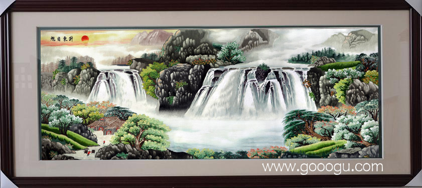 【蘇繡名稱(chēng)】:旭日東升裝飾壁畫(huà) 【蘇繡規(guī)格】:60*160(圖案尺寸) 88*200CM(外框尺寸) 【蘇繡工藝】:嬌古蘇繡工藝師手工刺繡 【外框材質(zhì)】:實(shí)木框拉丁木 【絲線材質(zhì)】:蠶絲線 【蘇繡檔次】:6-8絲刺繡。 【嬌古蘇繡出廠價(jià)】:5600元(含運(yùn)費(fèi)) 【發(fā)貨方式】:由我司安排發(fā)往客人指定地點(diǎn) 【作品介紹】:開(kāi)運(yùn)風(fēng)景,作品瀑布寓意財(cái)源滾滾;左右各有兩個(gè)瀑布,寓意左右逢緣事業(yè)生機(jī)旺盛;水潭寓意聚寶盆;旭日寓意鴻運(yùn)當(dāng)頭;作品左邊之樹(shù)為招財(cái)樹(shù),右邊之樹(shù)為擋災(zāi)樹(shù);整幅作品滿含鴻運(yùn)當(dāng)頭,財(cái)運(yùn)如浩浩瀑水,生生不息之意。作品中遠(yuǎn)山層巒疊峰,更表達(dá)了旭日東升的意境。 【細(xì)節(jié)欣賞一】 .jpg)