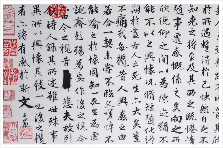 【品 牌】:嬌古 (作品代碼 D-1042) 【品 名】:蘭亭序裝飾畫(huà)(手工蘇繡) 【品 質(zhì)】:2-4絲刺繡 (蘇繡小知識(shí):1根蘇繡絲線可分為16絲,中檔刺繡皆為10絲所繡,中高檔刺繡皆為6-8絲,高檔刺繡皆為4-6絲,精品刺繡皆為1-4絲) 【尺 寸】:畫(huà)心尺寸44*117cm 整體尺寸60*147cm 【產(chǎn)品工藝】:手工刺繡+真絲底料 【絲線材質(zhì)】:蠶絲線 【用 途】:家居裝飾及政府禮品、外賓禮品、生日禮物、賀壽禮品、領(lǐng)導(dǎo)升遷、出國(guó)禮品等等。 【出廠價(jià)格】:12000元 【作品介紹】:東晉穆帝(司馬聃)永和九年(公元353年)三月初三日,王羲之和當(dāng)時(shí)名士孫綽、謝安和釋支遁等四十一人,為禊事活動(dòng),在蘭亭宴集。與會(huì)的人士都有詩(shī)作,事后把這些詩(shī)篇匯編成集,《蘭亭集序》就是王羲之為這個(gè)詩(shī)集所寫(xiě)的序言。序,文體名,是對(duì)書(shū)籍和文章舉其綱要、論其大旨的一種文字,相當(dāng)于引言。 《蘭亭集序》文字燦爛,字字珠璣,是一篇膾炙人口的優(yōu)美散文,它打破成規(guī),自辟?gòu)锦?,不落窠臼,雋妙雅逸,不論繪景抒情,還是評(píng)史述志,都令人耳目一新。雖然前后心態(tài)矛盾,但總體看,還是積極向上的,特別是在當(dāng)時(shí)談玄成風(fēng)的東晉時(shí)代氣氛中,提出一死生為虛誕,齊彭殤為妄作,尤為可貴?!短m亭集序[1]》的更大成就在于它的書(shū)法藝術(shù)。通篇?dú)庀⒌涂侦`、瀟灑自然;用筆遒媚飄逸;手法既平和又奇崛,大小參差 ,既有精心安排藝術(shù)匠心,又沒(méi)有做作雕琢的痕跡,自然天成。其中,凡是相同的字, 寫(xiě)法各不相同,各有變化,特別是字,達(dá)到了藝術(shù)上多樣與統(tǒng)一的效果?!短m亭集序》是王羲之書(shū)法藝術(shù)的代表作,是中國(guó)書(shū)法藝術(shù) 史上的一座高峰,它滋養(yǎng)了一代又一代書(shū)法家。 在結(jié)構(gòu)和章法上以情感為線索,敘中有情,以情說(shuō)理。第一段在清麗的境界中,著重寫(xiě)樂(lè)字,由樂(lè)而轉(zhuǎn)入沉思,引出第二段的痛字,在經(jīng)過(guò)一番痛苦的思考后,不覺(jué)感到無(wú)限的悲哀,最后以一悲字作結(jié)。情感色彩迥乎不同,前后過(guò)渡卻妥帖自然。 細(xì)節(jié)圖