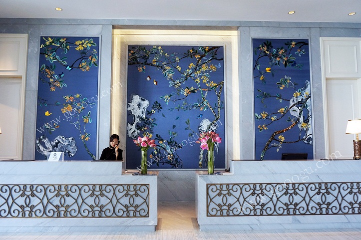 嬌古蘇繡負責(zé)承接綠城集團杭州尊藍錢江豪華精選酒店大堂的背景工程,該項工程由近30位繡娘耗時數(shù)月完成,刺繡效果層次鮮明、顏色過渡均勻自然,得到綠城集團領(lǐng)導(dǎo)的一致好評。“在最短的時間內(nèi)做出最好的效果,為我們開業(yè)贏得了寶貴的時間”,是綠城集團領(lǐng)導(dǎo)對嬌古蘇繡的評價。